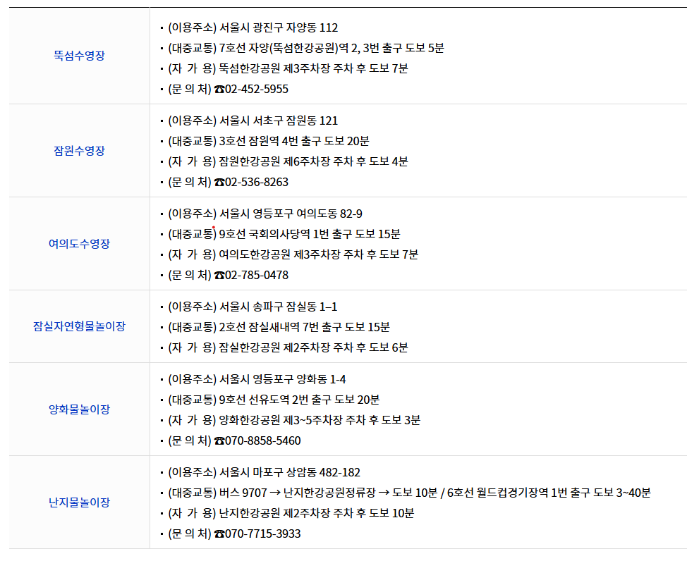 뚝섬, 잠원, 여의도, 잠실자연형, 양화, 난지 총 6군데 수영장과 물놀이 시설을 이용할수 있습니다.